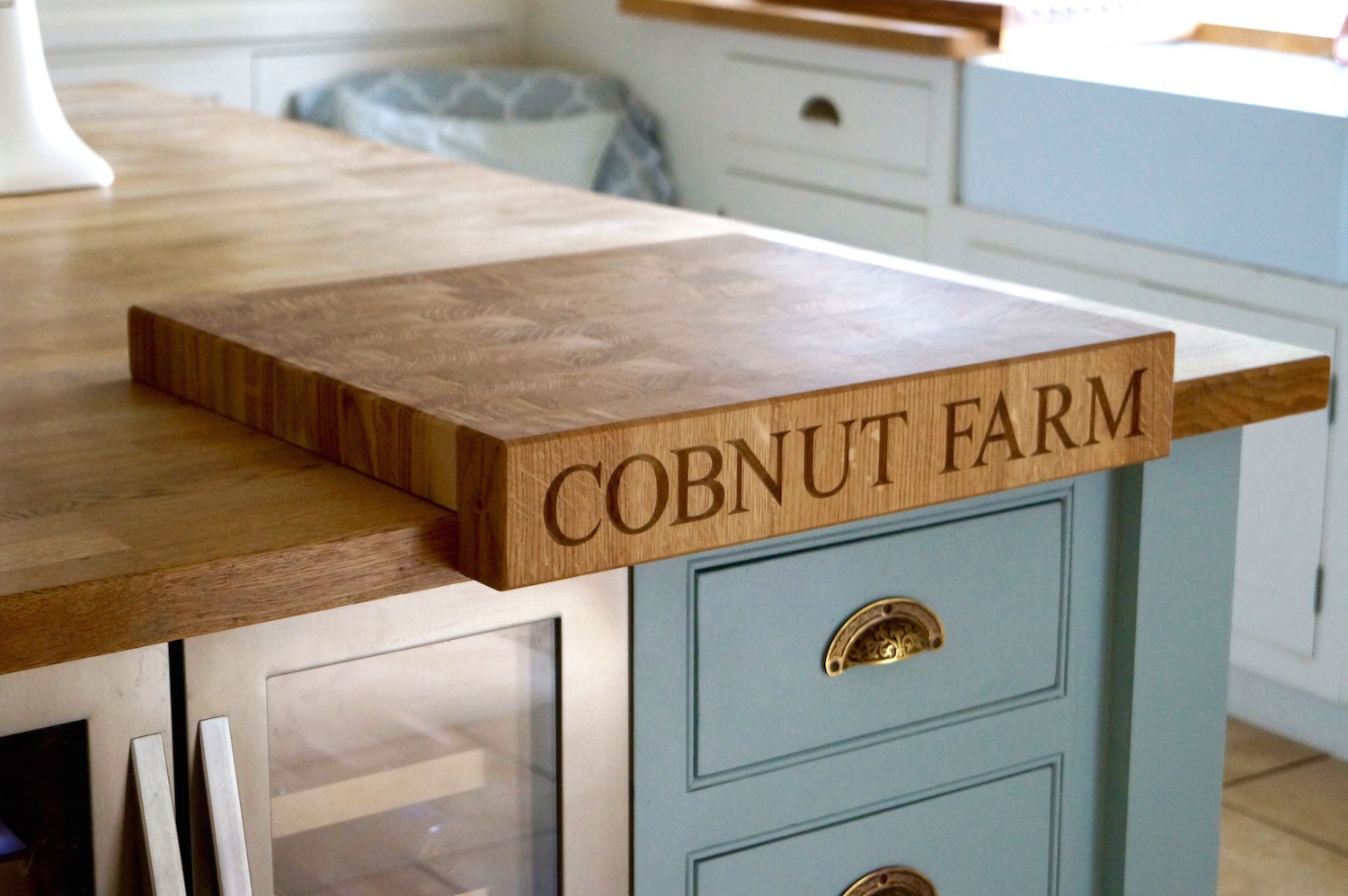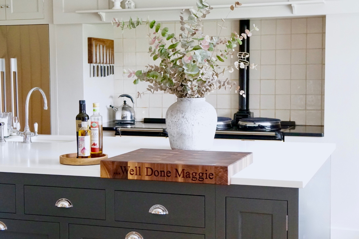 Once you have chosen your chopping board size you can then tell us how deep you want the lipped edge to overhang. We would recommend taking the time to measure the thickness of your worktop and choose the same depth for the lip. Most wooden worktops are around 4cm thick and most stone and granite tops between 25 – 30mm. This will give a continuous uninterrupted look to your chopping board when in situ when in your kitchen. This will also make sure the overhanging lipped edge of your chopping board does not interfere with drawer or door openings.