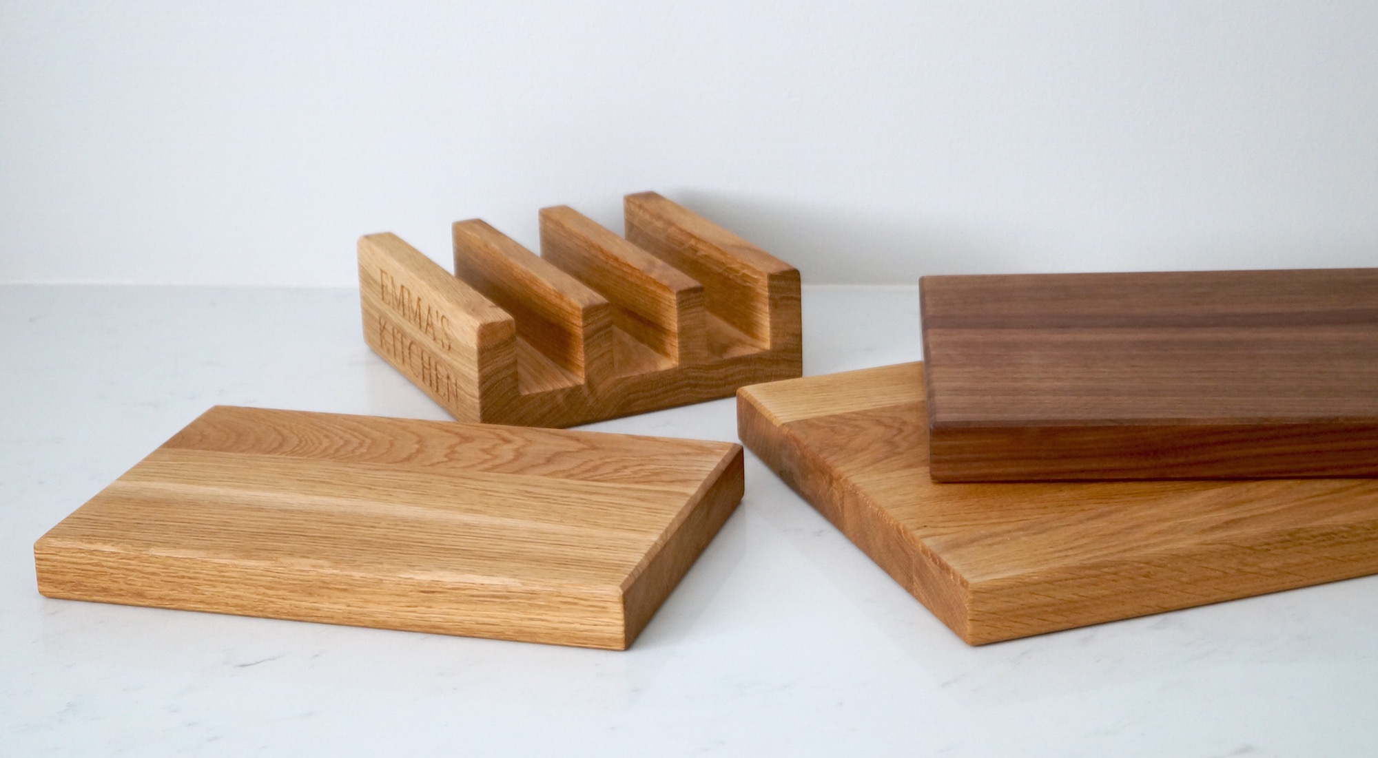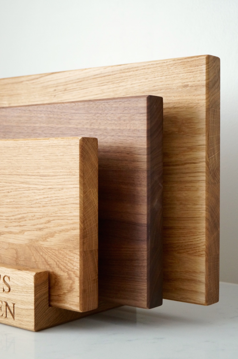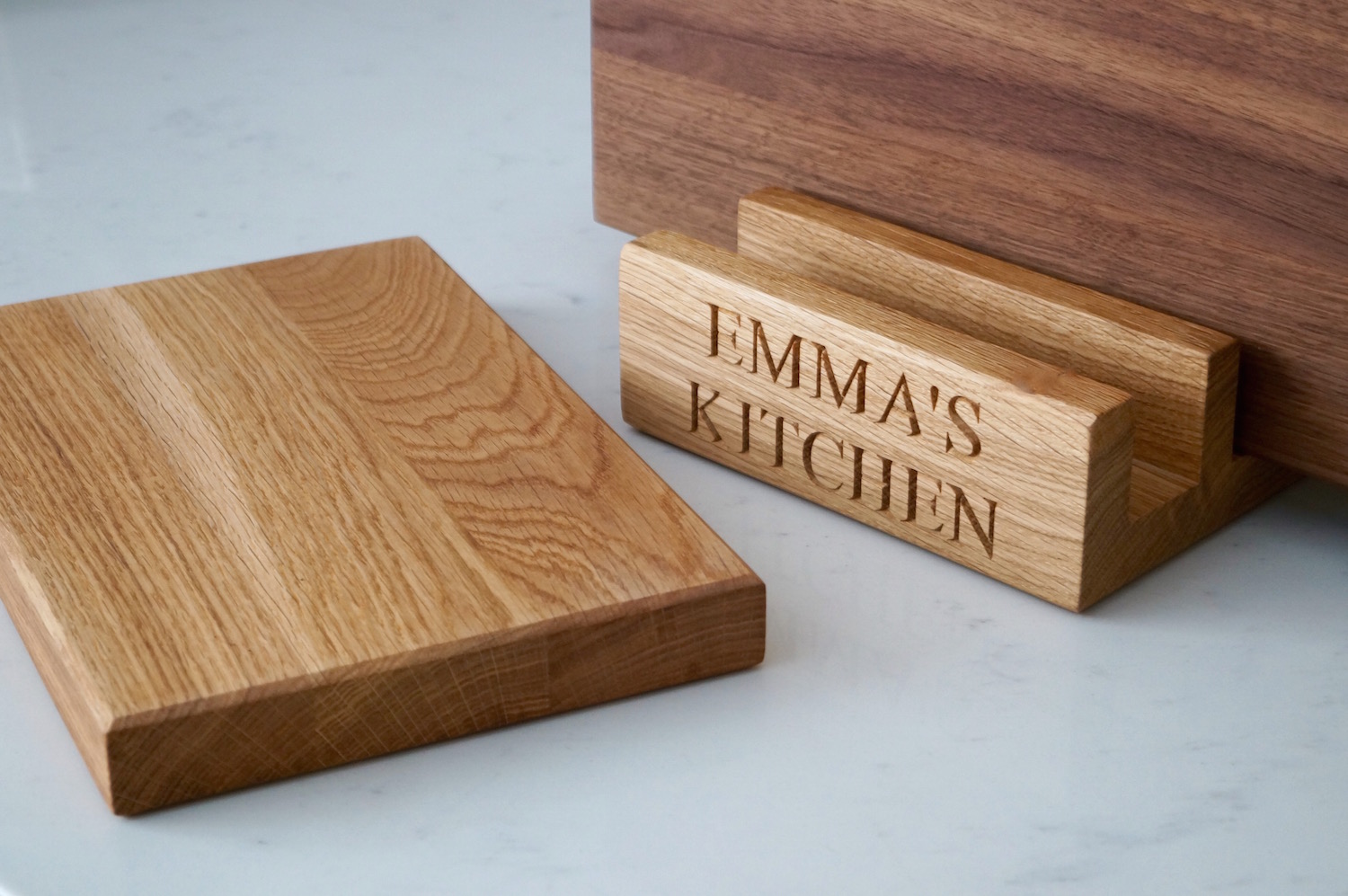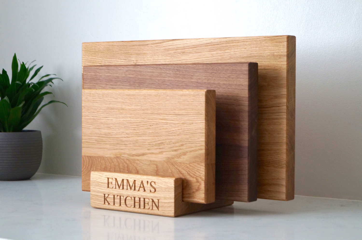 This is our brand new chopping board set, complete with a personalised oak stand.
