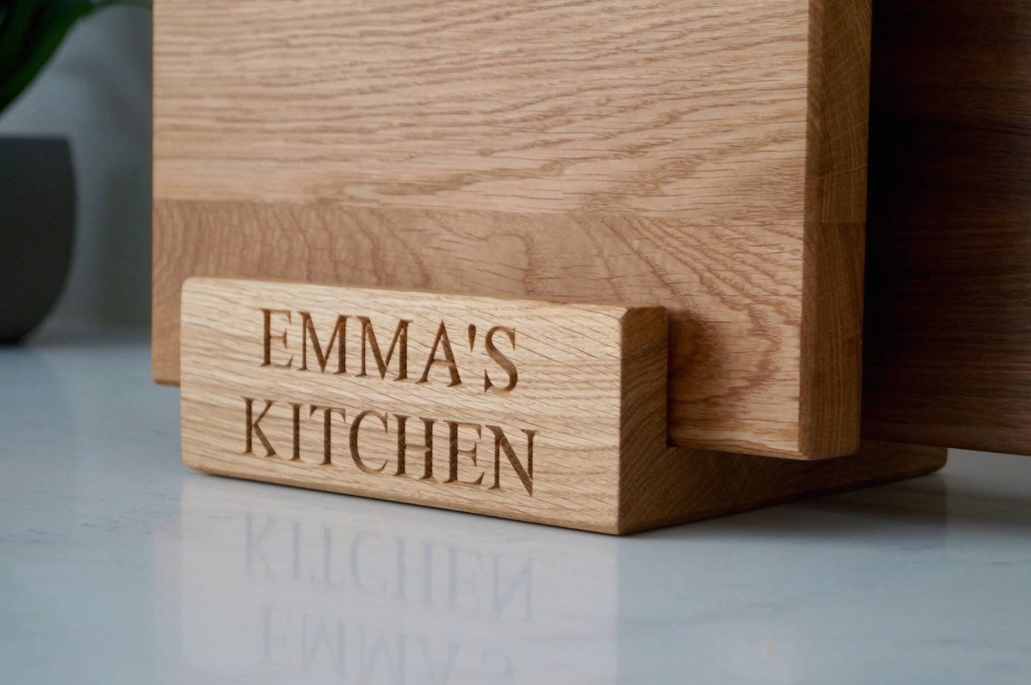 The chopping board stand can be personalised with your choice of words or lettering. Up to 20 characters on the front face. If you require further engraving, you can also add another 20 characters to the rear face of the stand. Perfect for names, dates, quotes or messages. Making this chopping board set a really nice personalised gift for weddings, 5th wedding anniversaries, birthdays, house warming and other special occasions.