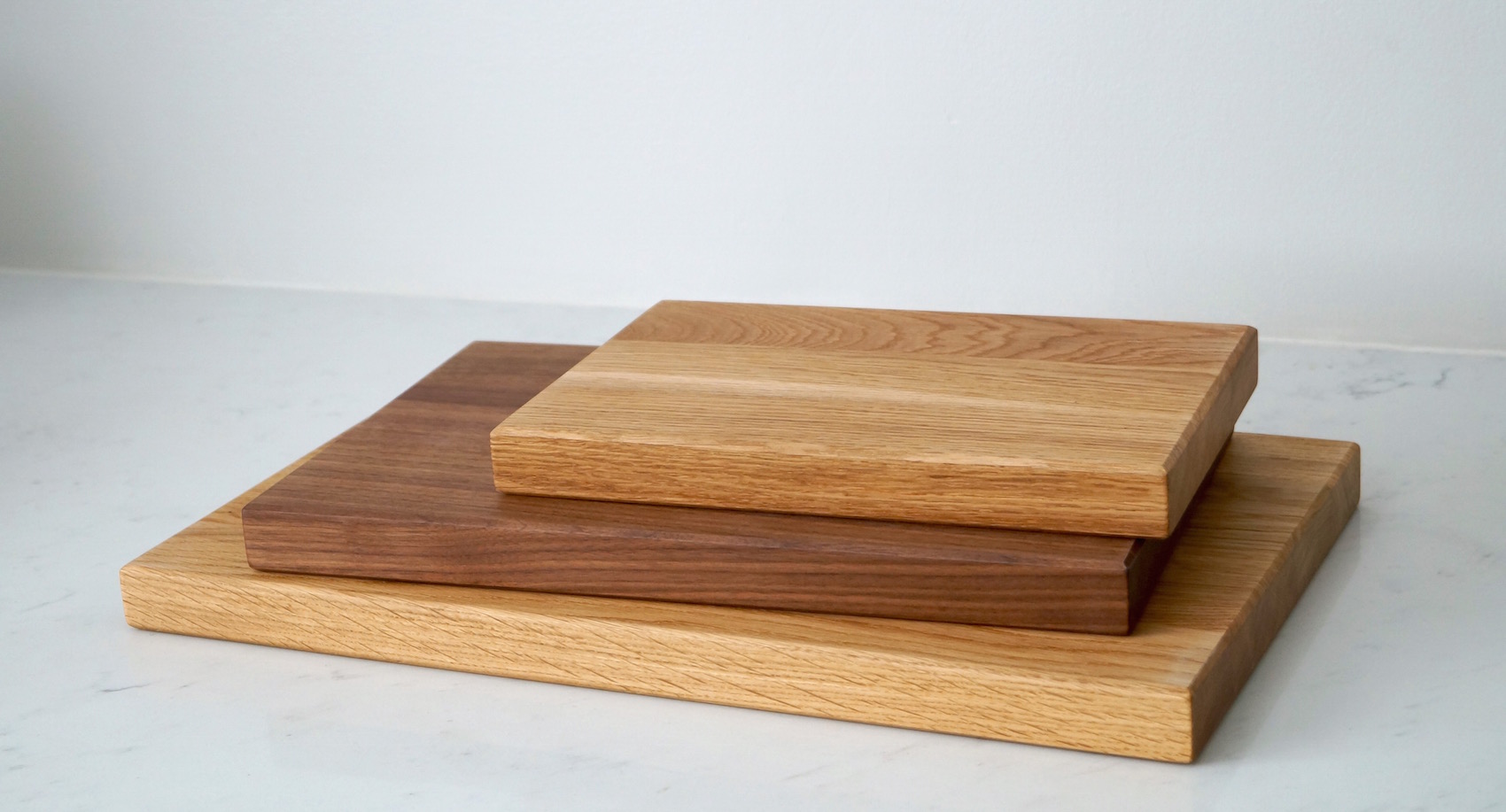 Every one of these wooden chopping boards are handmade by our skilled craftsmen in our Surrey Hills workshop, from start to finish, using the best Amish American hardwoods from New England. The boards are extremely high quality and built to last for many years. Both the small and the large chopping boards are made from solid American White Oak and the medium size is made from solid American Black Walnut giving a nice contrast within the set.