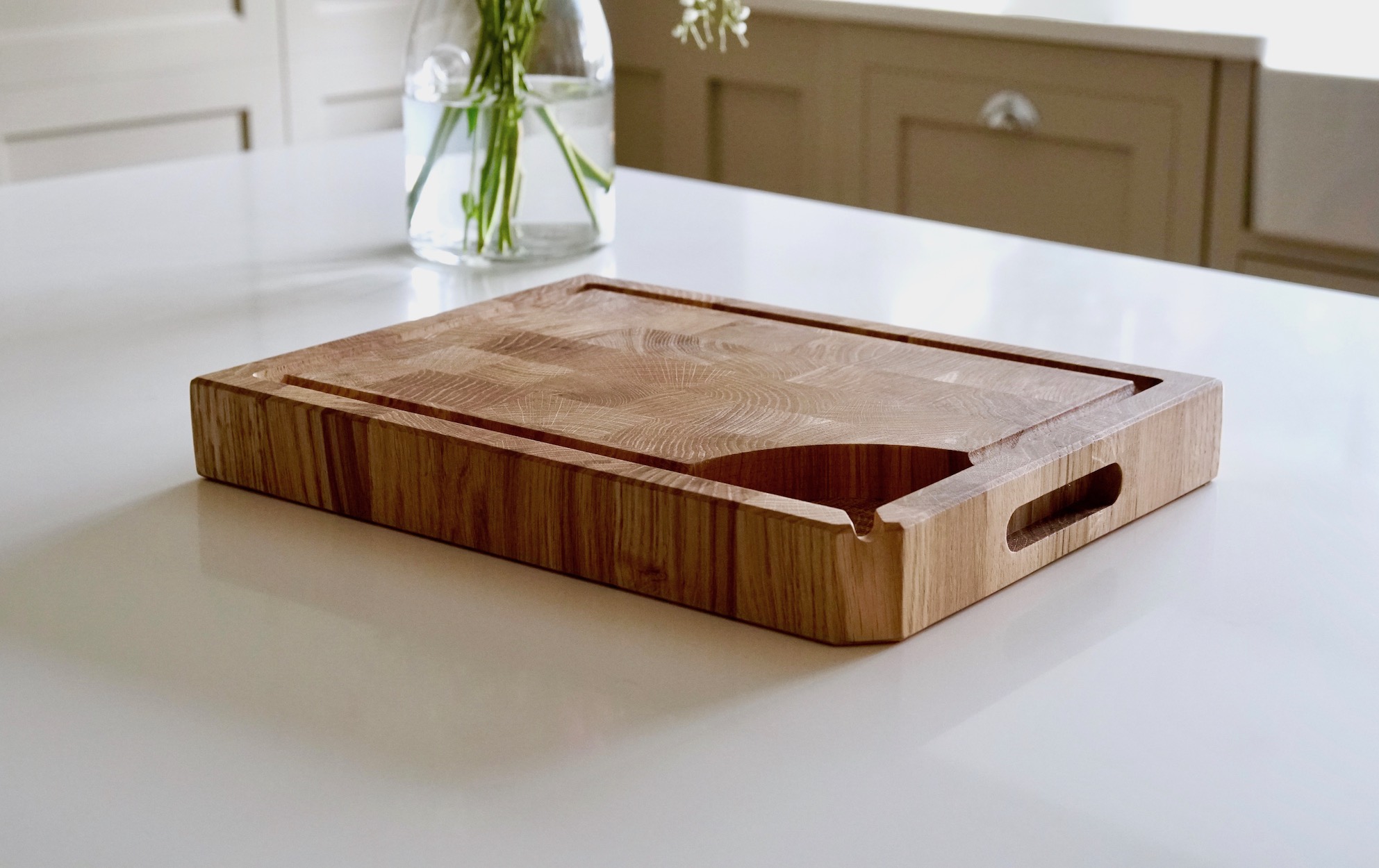 They have inset side handles in the middle of the board, so you can continuously rotate the cutting board with ease. One side of the board is completely flat, ideal for chopping vegetables and fruit. The other side features a large surface groove for catching juices from roasting joints. We can also add a corner well and spout, like our traditional wooden carving boards if needed, perfect for collecting the meat juices in one place making it easy to be added to your gravy or sauce.