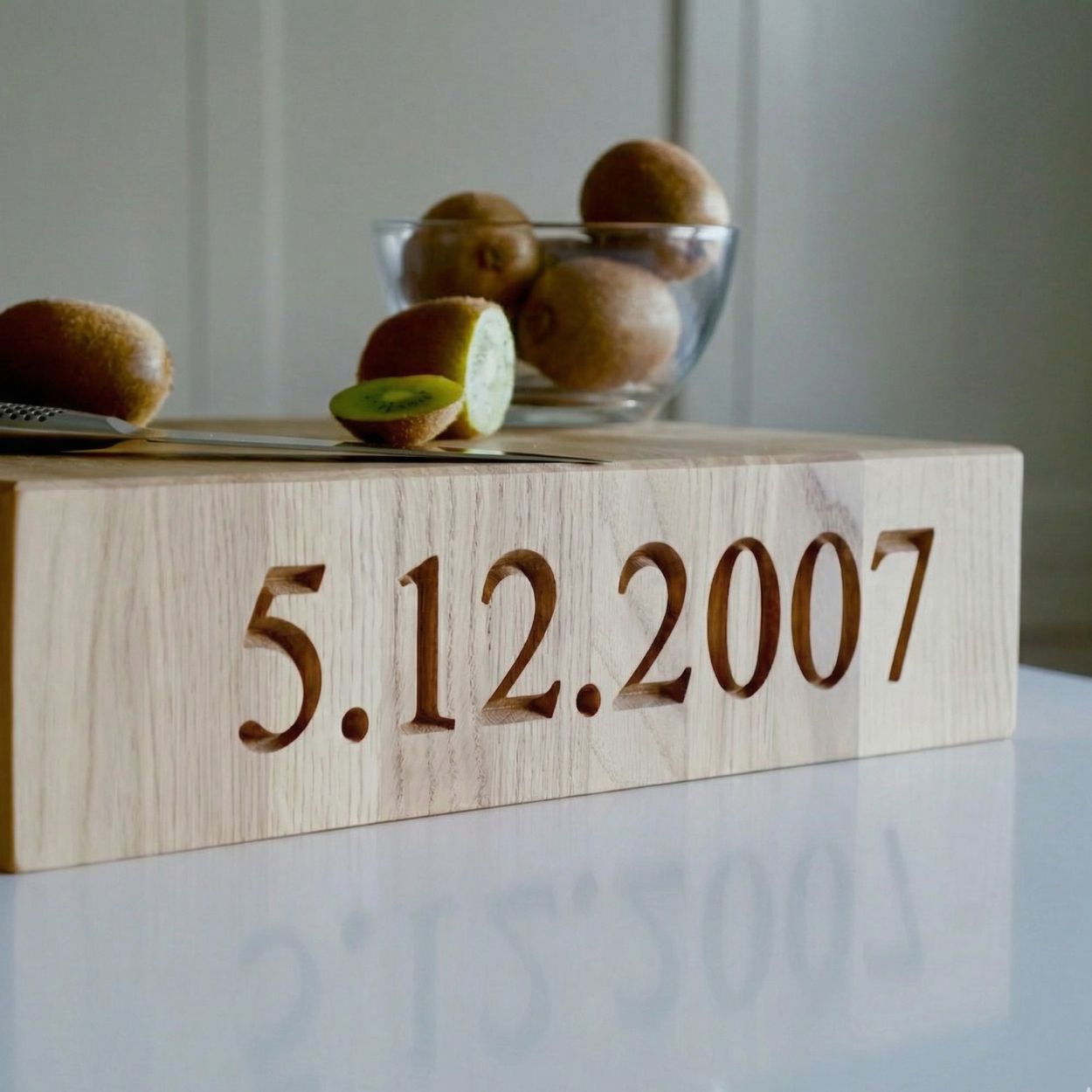 Available in oak or walnut, in a range of sizes, with options for cutout side handles, surface groove, and personalised engraving along the edge. A private message can also be added to the underside — a name, a date, a recipe that has been in the family for years.