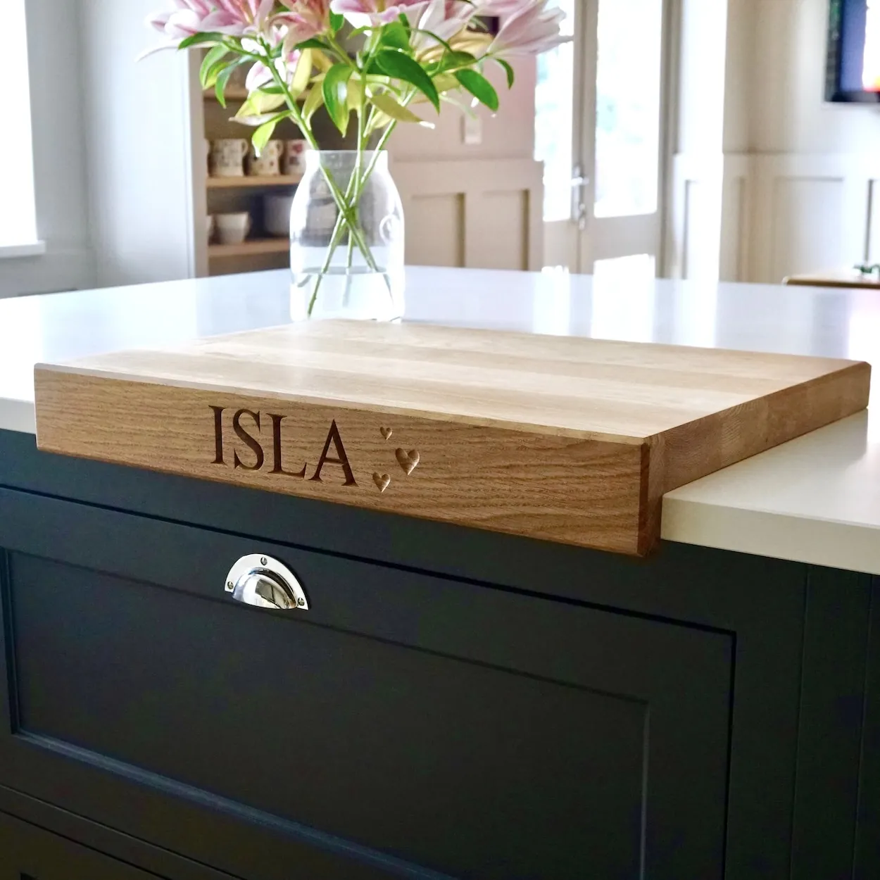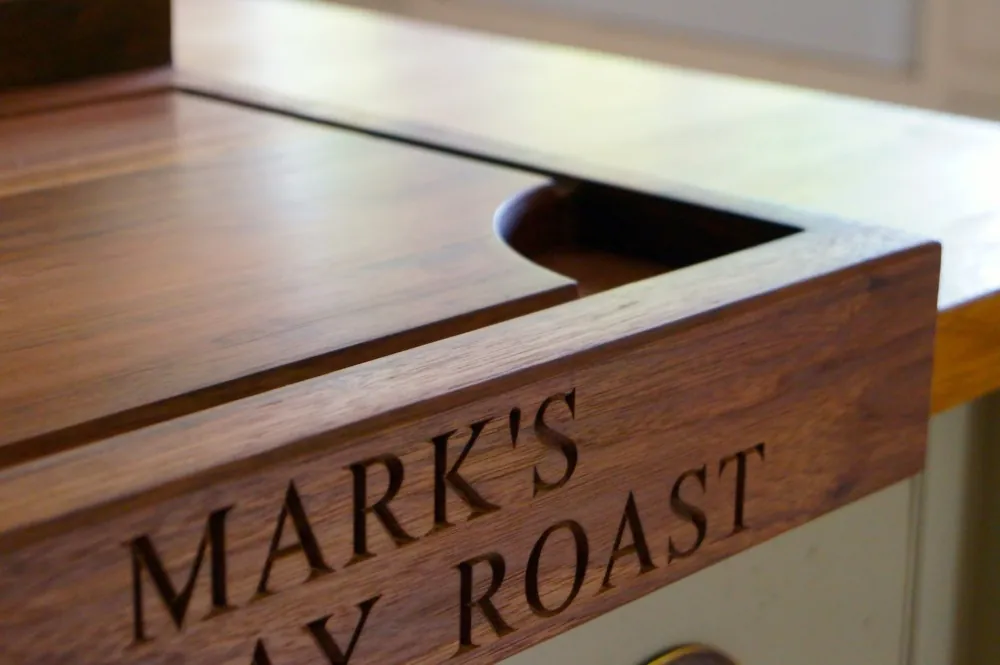 Made from solid English oak or American Black Walnut and hand-finished in our Surrey Hills workshop, these boards are built to last. Available in a generous range of sizes, each board is made to order. The engraving — your choice of name, initials, a date, or a carved motif — is cut directly into the timber for a finish that will still be as crisp in twenty years as the day you received it.