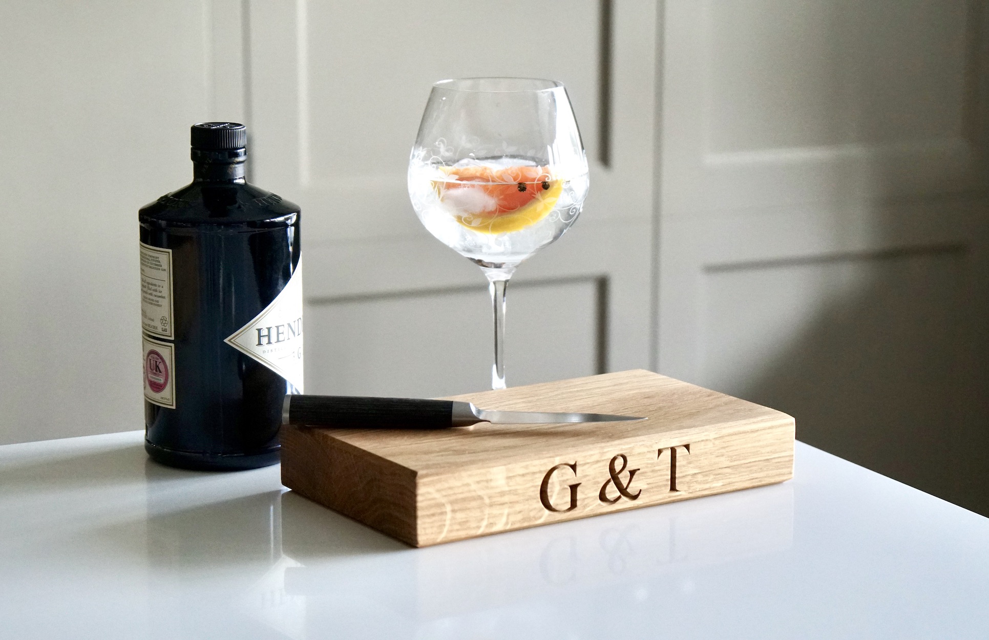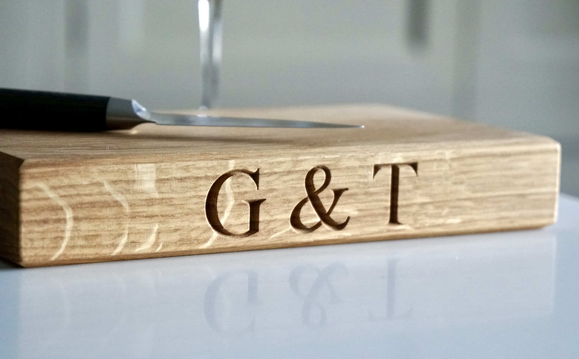 Our engraved oak G&T chopping board is a small but perfectly considered board for the ritual of a good gin and tonic. Solid English oak, hand-finished in our Surrey Hills workshop, pre-engraved with the G&T motif — a neat, confident piece of kitchen personality that works as a dedicated slicing board for your garnishes and as a serving board for the whole production.
