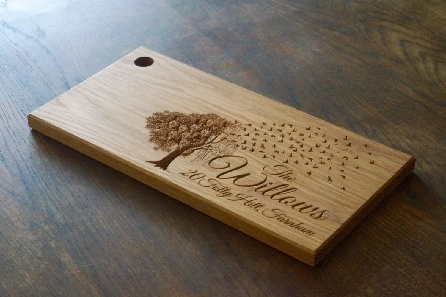 Our engraved wooden serving boards are made to be brought out and shown off — a generous, solid English oak surface for cheeses, charcuterie, bread, fruit, and anything else that deserves to arrive at the table on something properly made. Hand-finished in our Surrey Hills workshop, each board has the weight and warmth that only solid timber brings.