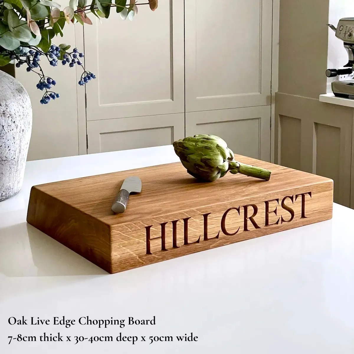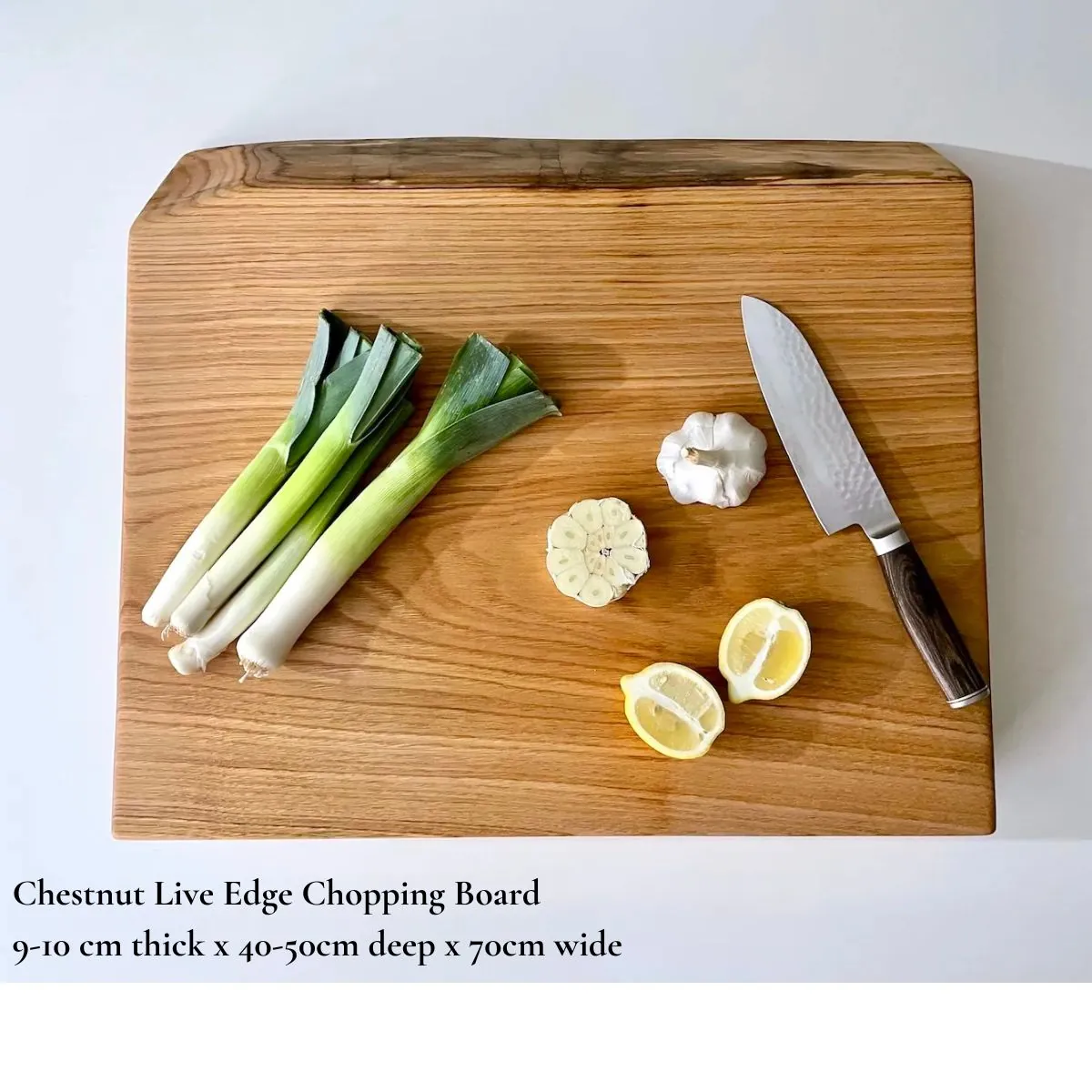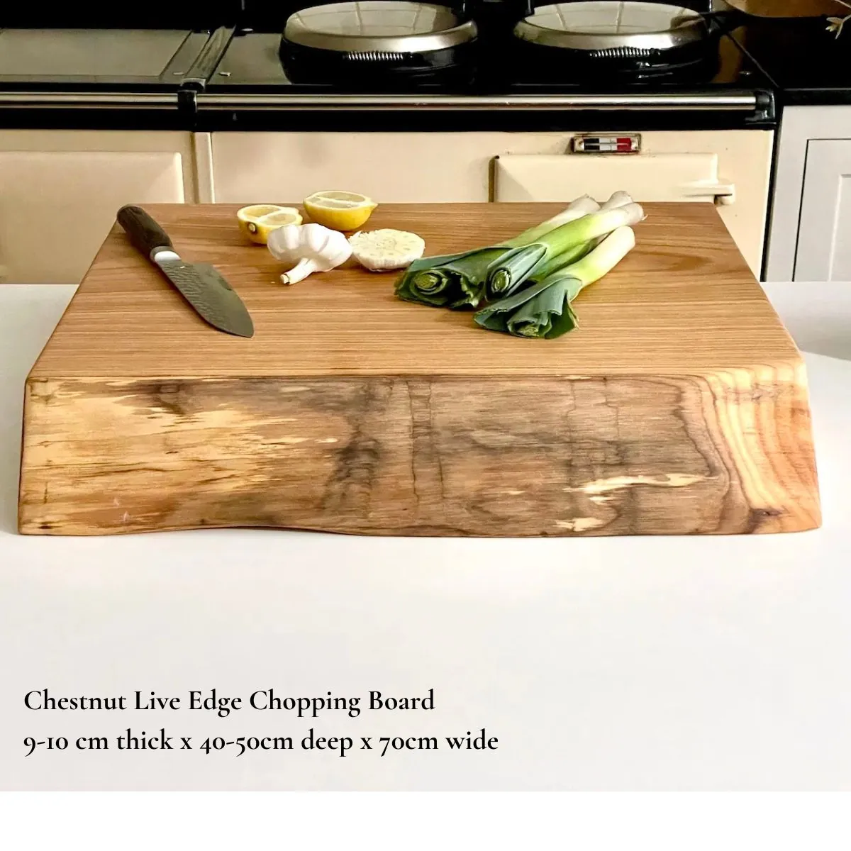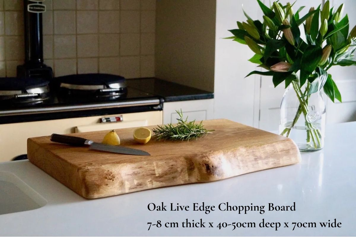 Our extra-large live-edge chopping boards are made from some of the finest single pieces of English oak we can source — wide, thick, and with that sweeping natural edge that makes a kitchen feel like a proper cook’s space. Every board is hand-selected, prepared and finished in our Surrey Hills workshop, made to order to the exact dimensions that suit you.