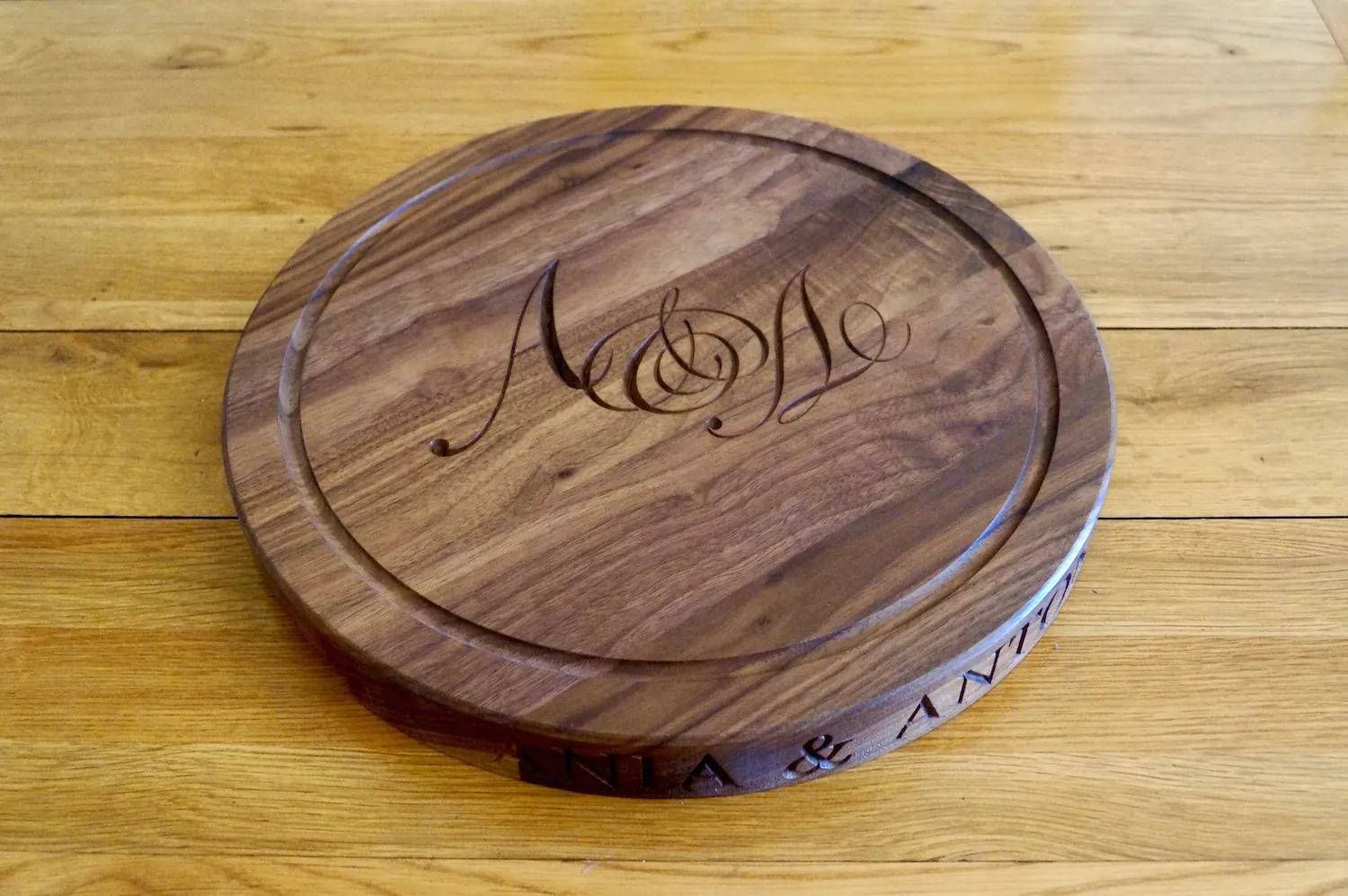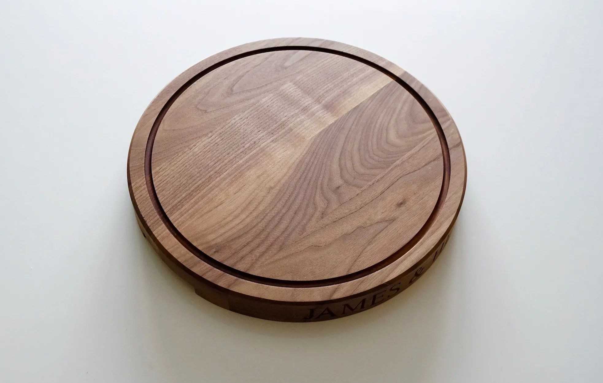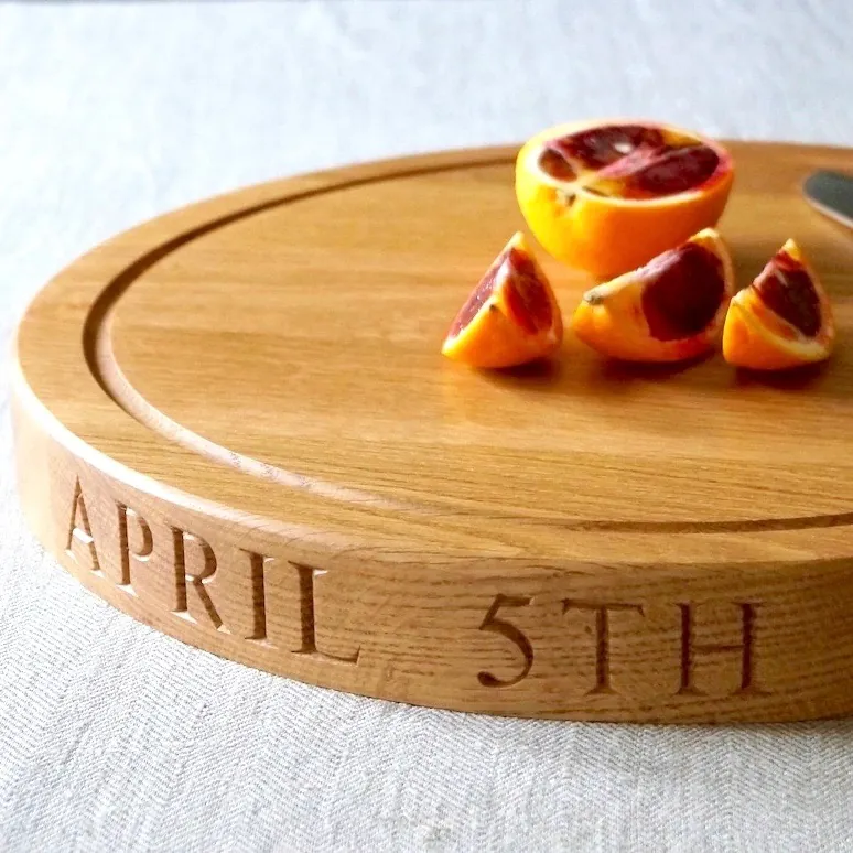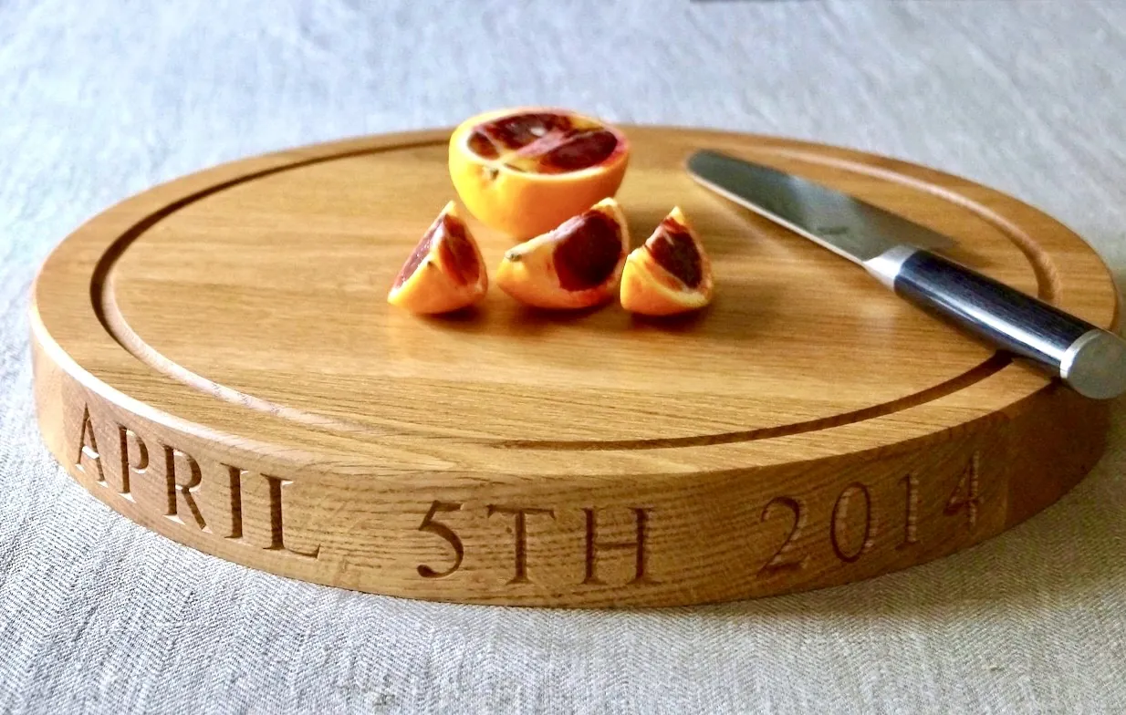 Available in a choice of sizes, each board is made to order. They can be left plain or personalised with engraved lettering or a carved motif around the edge or across the face. A private message can be added to the underside — a toast, a name, a date, or something only the recipient will find.